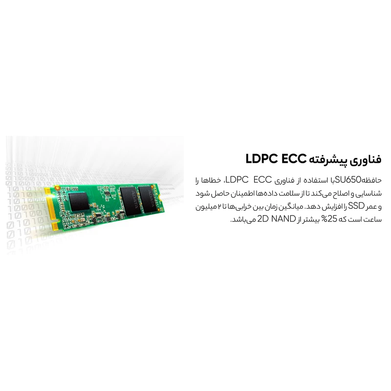 تکنولوژی تصحیح خطای LDPC ECC کارایی و دوام SU650 را در مقایسه با اساسدیهایی که از این فناوری استفاده نمیکنند دو چندان کرده است. علاوه بر این SU650 با کمک این تکنولوژی می تواند یکپارچگی اطلاعات را تضمین کند و در صورت بروز مشکل، ایرادات را برطرف نماید و MTBF این دستگاه را تا 2 میلیون ساعت افزایش دهد، یعنی 25درصد بیشتر از SSD هایی با تکنولوژی 2Dنرم افزار رایگان ADATA SSD Toolbox پیکربندی، بهینه سازی و پایش SSD را به راحتی و با سرعت بالا امکان پذیر میسازد. این نرم افزار شرایط کلی و اطلاعات دقیق عمر محصول و سالم بودن درایو را نشان می دهد. همچنین نرمافزار انتقالی که همراه SU650 ارائه میشود مناسب کسانیاست که میخواهند از هارددیسک قدیمی خود به SSD مهاجرت کنند!