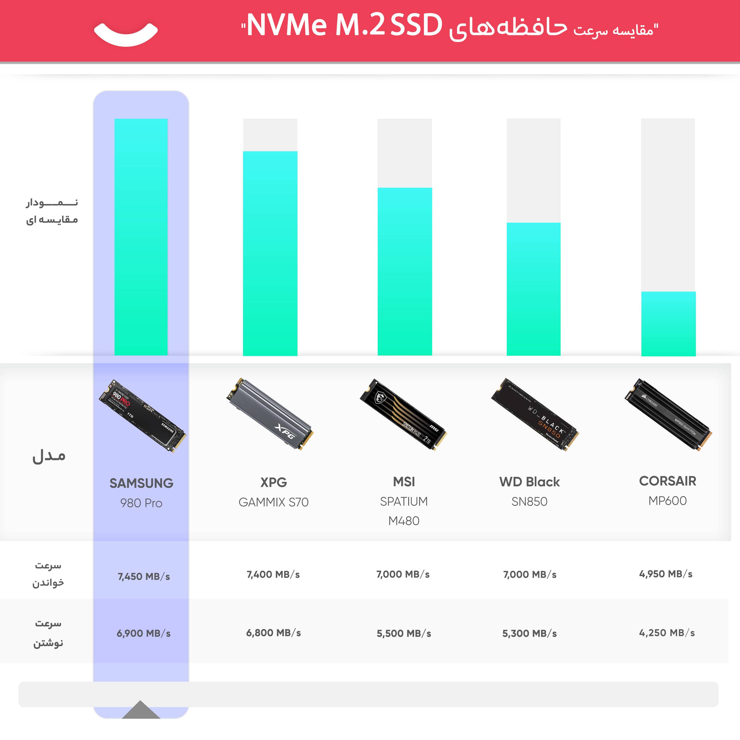 SSD سامسونگ 980PRO با ظرفیت 1 ترابایت، با سرعت خواندن و نوشتن بالا، مصرف انرژی کم، دوام بالا و نصب آسان، گزینه‌ای عالی برای ارتقاء سیستم‌های کامپیوتری است. این محصول با پشتیبانی از نسل چهارم NVMe و تکنولوژی PCIe 4.0، تجربه‌ای بی‌نظیر از کارایی و سرعت را به کاربران ارائه می‌دهد. با توجه به نظرات کاربران و مقایسه با رقبا، می‌توان نتیجه گرفت که SSD سامسونگ مدل 980PRO   یکی از بهترین حافظه‌های SSD موجود در بازار است که می‌تواند نیازهای مختلف کاربران را برآورده سازد.