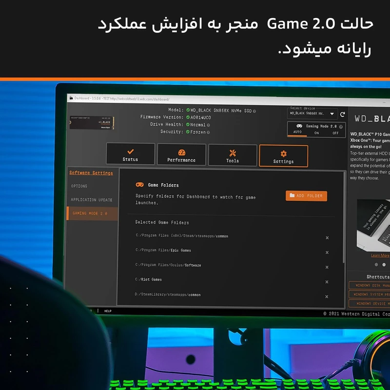 نرم افزار WD BLACK Dashboard هم که مخصوص محصولات سری Black وسترن دیجیتال طراحی شده، به راحتی قابل دانلود است و میتواند عملکرد این ماژول حافظه را بیش از پیش ارتقا دهد. این نرم افزار شامل قابلیتهایی مانند Game Mode 2.0 و ابزارهای اضافی برای افزایش عملکرد رایانه شخصی است.