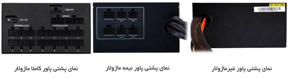 هنگام تهیهی یک پاور معمولا یکی از واژههای ماژولار، نیمه ماژولار یا غیرماژولار دیده میشود. البته باید توجه داشت که معمولا شرکتهای سازنده در نام پاورهای غیرماژولار اشارهای به غیرماژولار بودن آن نمیکنند. پاورهای غیرماژولار پاورهایی هستند که در قسمت پشتی محصول تعداد زیادی کابل دارند که در انتهای خود دارای کانکتورهای مختلفی هستند. این پاورها معمولا قیمت مناسبتری نسبت به دو مدل دیگر دارند و اگر برای تهیهی پاور مبتدی هستید یا از تجهیزات حرفهای برای سیستم خود استفاده نمیکنید، این گروه از پاورها برای شما انتخاب مناسبی خواهند بود. در پاورهای ماژولار شاهد تعداد زیادی کانکتور در پشت محصول خواهیم بود ولی خبری از خارج شدن هیچگونه کابلی از پشت محصول نیستیم. درواقع شرکت سازنده کانکتورهایی را روی محصول قرار داده تا تنها از طریق کابلهای ارائهشده در جعبهی محصول اقدام به کابلکشی شود. این کار باعث میشود تا شاهد شلوغی در کیس کامپیوتر نباشیم. پاورهای ماژولار نسبت به مدلهای غیرماژولار و نیمه ماژولار گرانتر هستند. پاورهای نیمه ماژولار را میتوان بین دو مدل ماژولار و غیرماژولار دانست. یعنی تعدادی کانکتور به اضافهی یک کابل برق از پاور خارج خواهد شد.