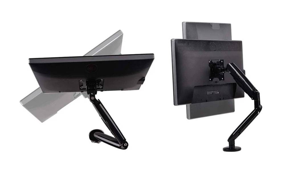 این پایه امکان گردش 360 درجه صفحه مانیتور، چرخش 15 درجه ای به سمت پایین و 85 درجه ای به سمت بالا، تنظیم فاصله دید، و گردش صفحه نمایش بصورت عمودی و افقی جهت رسیدن به بهینه ترین شرایط را فراهم می کند.