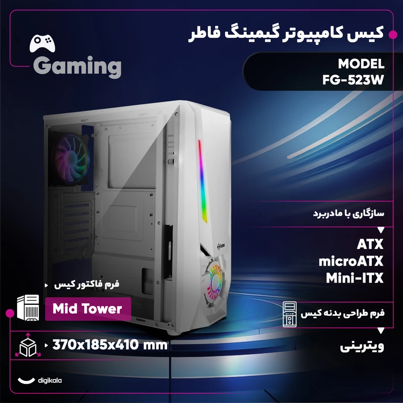 کیس فاطر مدل FG-523W با فرم فاکتور Mid Tower و طراحی ویترینی، نمای داخلی سیستم را از یک طرف شیشه‌ای به نمایش می‌گذارد و جلوه بصری جذابی ایجاد می‌کند. ابعاد ۳۷۰x۱۸۵x۴۱۰ میلی‌متر و وزن ۳.۵ کیلوگرم، این کیس را سبک و جمع‌وجور ساخته و امکان قرارگیری روی میزهای گیمینگ و فضاهای کوچک را فراهم می‌کند. سازگاری با مادربردهای ATX، microATX و Mini-ITX انعطاف کافی برای نصب قطعات مختلف را ارائه می‌دهد و کاربران می‌توانند سیستم خود را متناسب با نیاز گیمینگ یا کاری طراحی کنند. محل نصب پاور در پایین و پشت کیس قرار دارد و پاورهای ATX PS2 تا طول ۱۷۰ میلی‌متر پشتیبانی می‌شوند، که مدیریت کابل و جریان هوا را بهینه می‌کند.