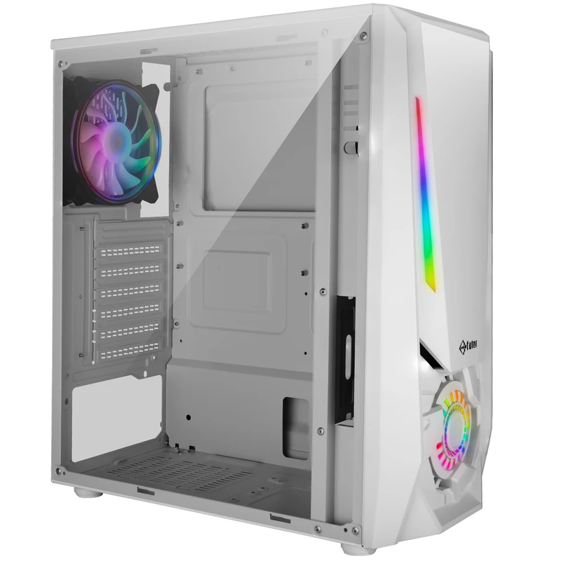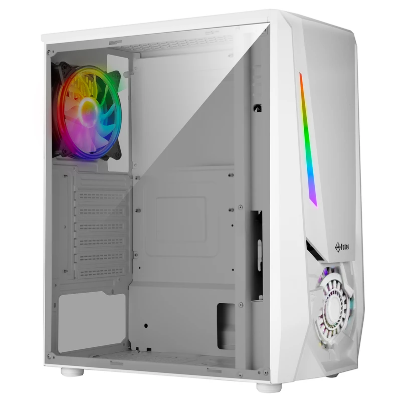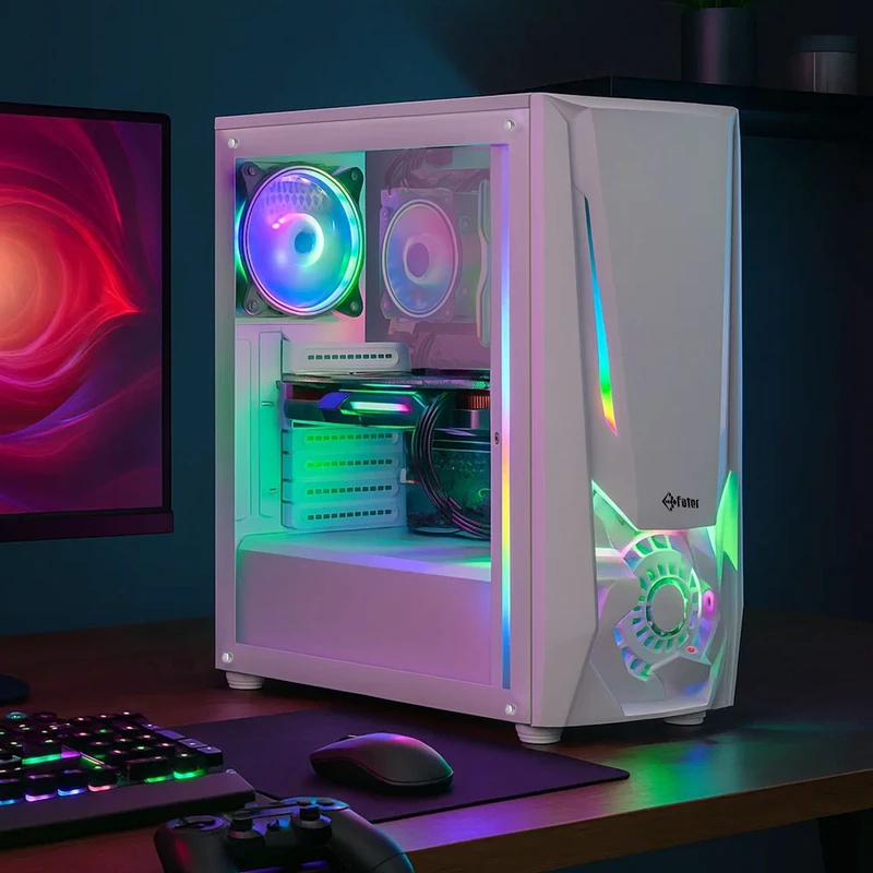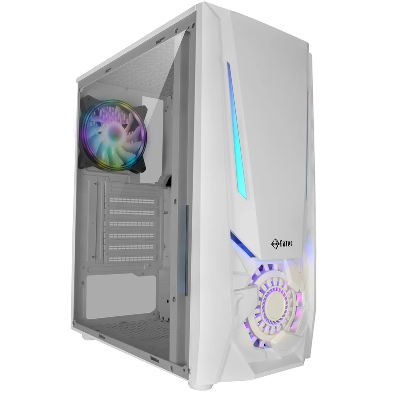 کیس فاطر مدل FG-523W نمونه‌ای مدرن و جمع‌وجور از سری Mid Tower است که برای گیمرها و کاربران حرفه‌ای طراحی شده و ترکیبی از طراحی زیبا، تهویه مؤثر و امکانات کاربردی ارائه می‌دهد. با ابعاد ۳۷۰x۱۸۵x۴۱۰ میلی‌متر و وزن ۳.۵ کیلوگرم، این کیس سبک و قابل حمل است و امکان قرارگیری روی میزهای گیمینگ کوچک یا فضاهای محدود را فراهم می‌کند، بدون اینکه از استحکام یا ظرفیت نصب قطعات کاسته شود. بدنه ترکیبی از فلز و شیشه، نمای داخلی سیستم را به نمایش گذاشته و جلوه‌ای مدرن و چشم‌نواز ایجاد می‌کند. طراحی ویترینی با پنل شیشه‌ای یک طرفه، علاوه بر زیبایی، دسترسی به قطعات و مدیریت کابل‌ها را ساده‌تر کرده و فضای داخلی مرتب و سازمان‌یافته باقی می‌ماند.