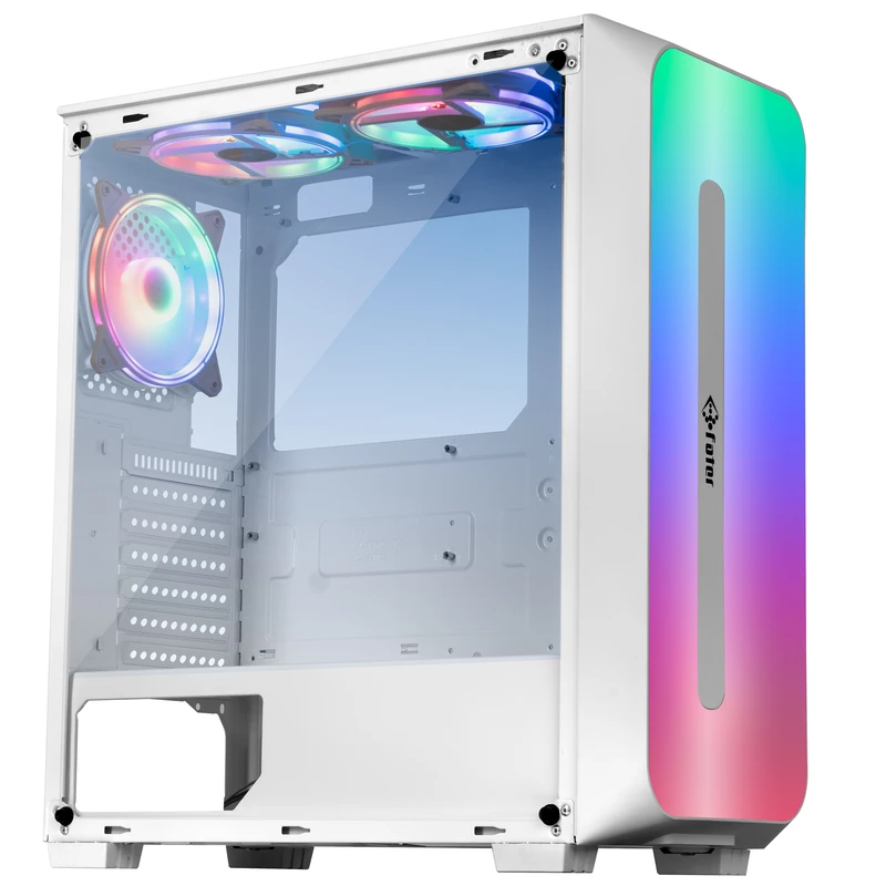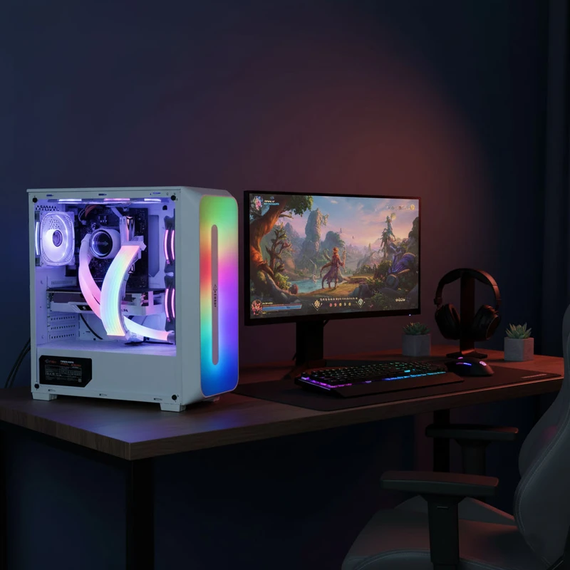 پنل جلویی کیس شامل دو پورت USB 2.0، یک پورت USB 3.0 و یک جک ۳.۵ میلیمتری است و دسترسی به اتصالات پرکاربرد را آسان کرده است. پایههای ضد لرزش در زیر کیس، لرزش و صدای اضافی ناشی از عملکرد قطعات را کاهش داده و جریان هوای بهتر در زیر کیس را نیز فراهم میکند. فنهای از پیش نصبشده با طراحی باله کوسه و عملکرد کاملاً بیصدا، جریان هوای مطلوب و نورپردازی جذاب را ترکیب کرده و تجربهای حرفهای از سیستم گیمینگ ارائه میدهند.