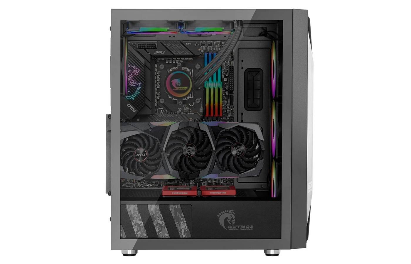 نورپردازی ARGB و امکان نصب کارت گرافیک به صورت عمودی با پشتیبانی از GREEN Riser Cable Kit جلوهای مدرن و حرفهای به کیس داده و کاربران حرفهای میتوانند از پیکربندیهای SLI و CrossFireX دوگانه یا سهگانه بهره ببرند. این قابلیتها نشان میدهد که گرین در طراحی GRIFFIN G3 Plus تنها به ظاهر توجه نکرده و کارایی و عملکرد حرفهای نیز اولویت اصلی بوده است.
