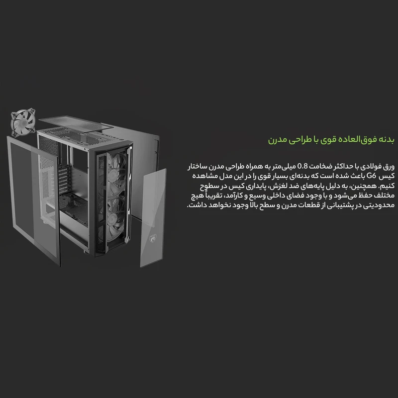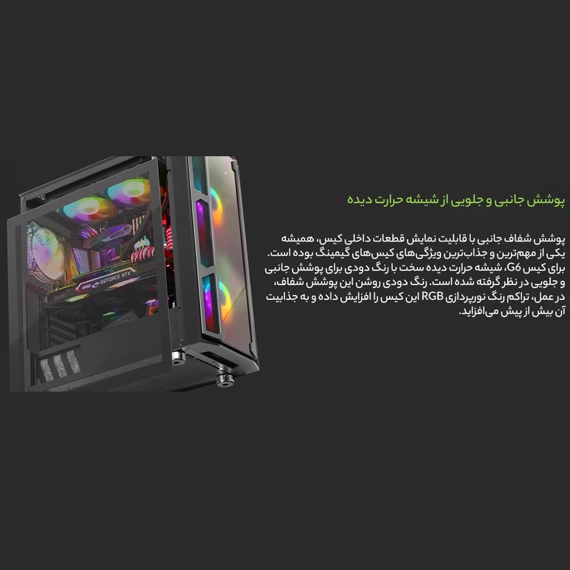 کیس GRIFFIN G6 گرین نمونه ای کامل از یک کیس مدرن و جذاب گیمینگ محسوب می شود. کولینگ قدرتمند به واسطه 2 فن 200mm در بخش جلویی کیس، نورپردازی ARGB با قابلیت کنترل از راه دور و همگام سازی با مادربرد (MB Sync)، همراه داشتن پورت (USB 3.1 Type-C Gen 2 (10Gbps، کاور کناری از جنس شیشه حرارت دیده سخت جهت نمایش کامل فضای داخلی و اسکلت فوق العاده مستحکم با طراحی مدرن و کم ترین محدودیت در نصب قطعات رده بالا از جمله قابلیت هایی است که انتخاب گریفین جی 6 را به شدت وسوسه انگیز می کند